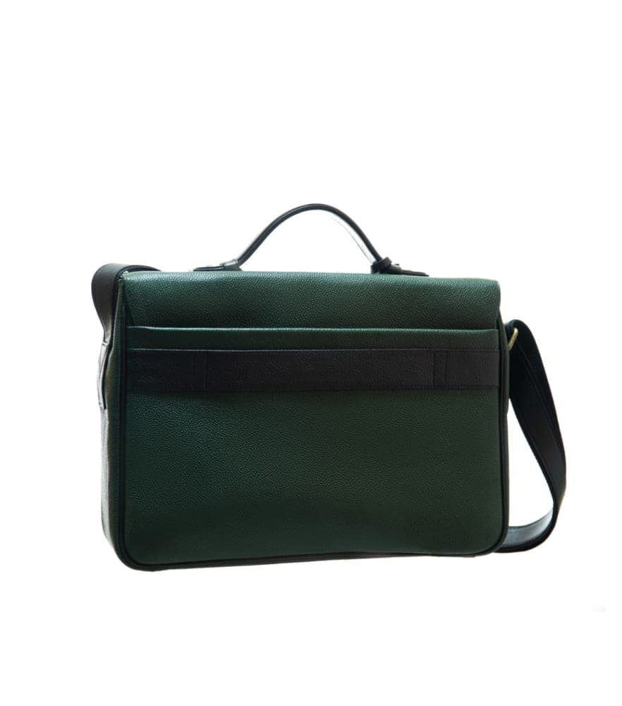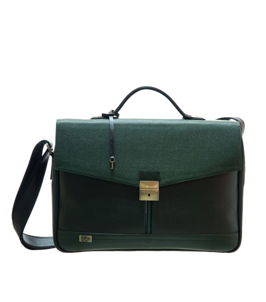 H x W x D 29 x 42 x 10 cm. / 12 x 17 x 4 in. Leather. Hand-loomed fabric (aso-oke) detailing. Single flat handle. Adjustable shoulder strap. Outer slip pocket and inner zippered pockets. Fabric-lined interior. Briefcase-lock closure. Brass hardware. All our bags are made-to-order and handcrafted. Every single one is one of a kind; please note that there maybe variations in the colour and texture of the materials used.